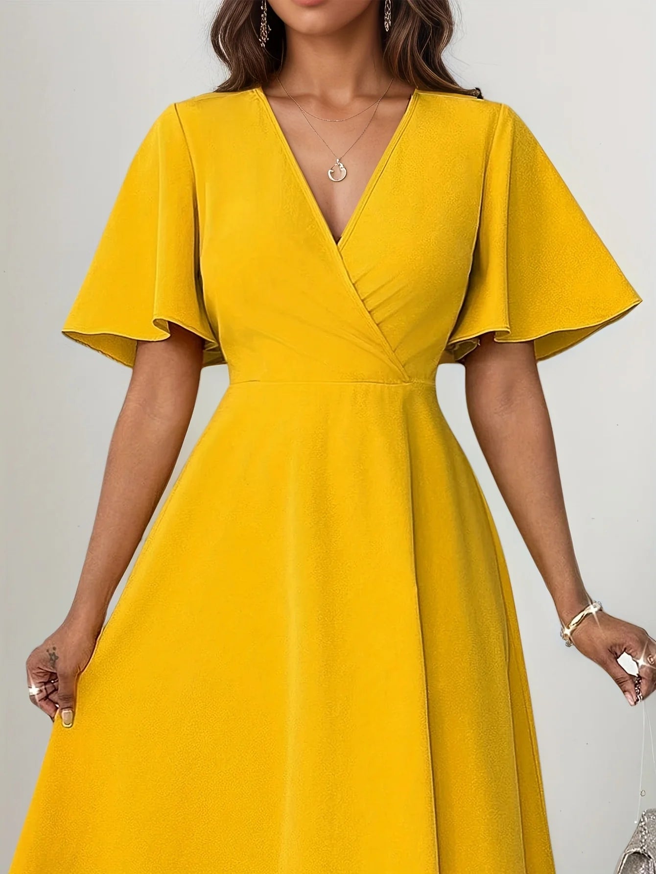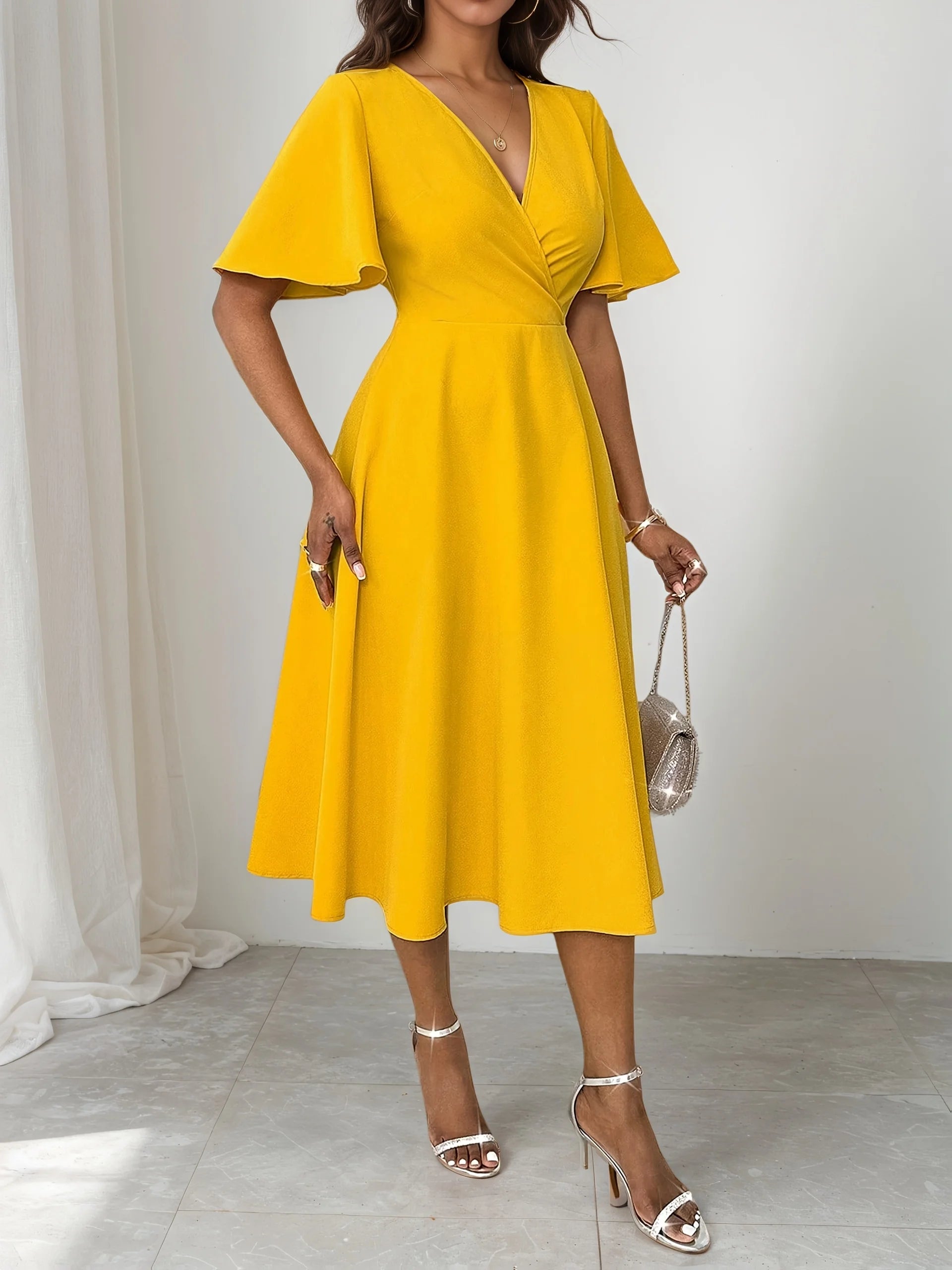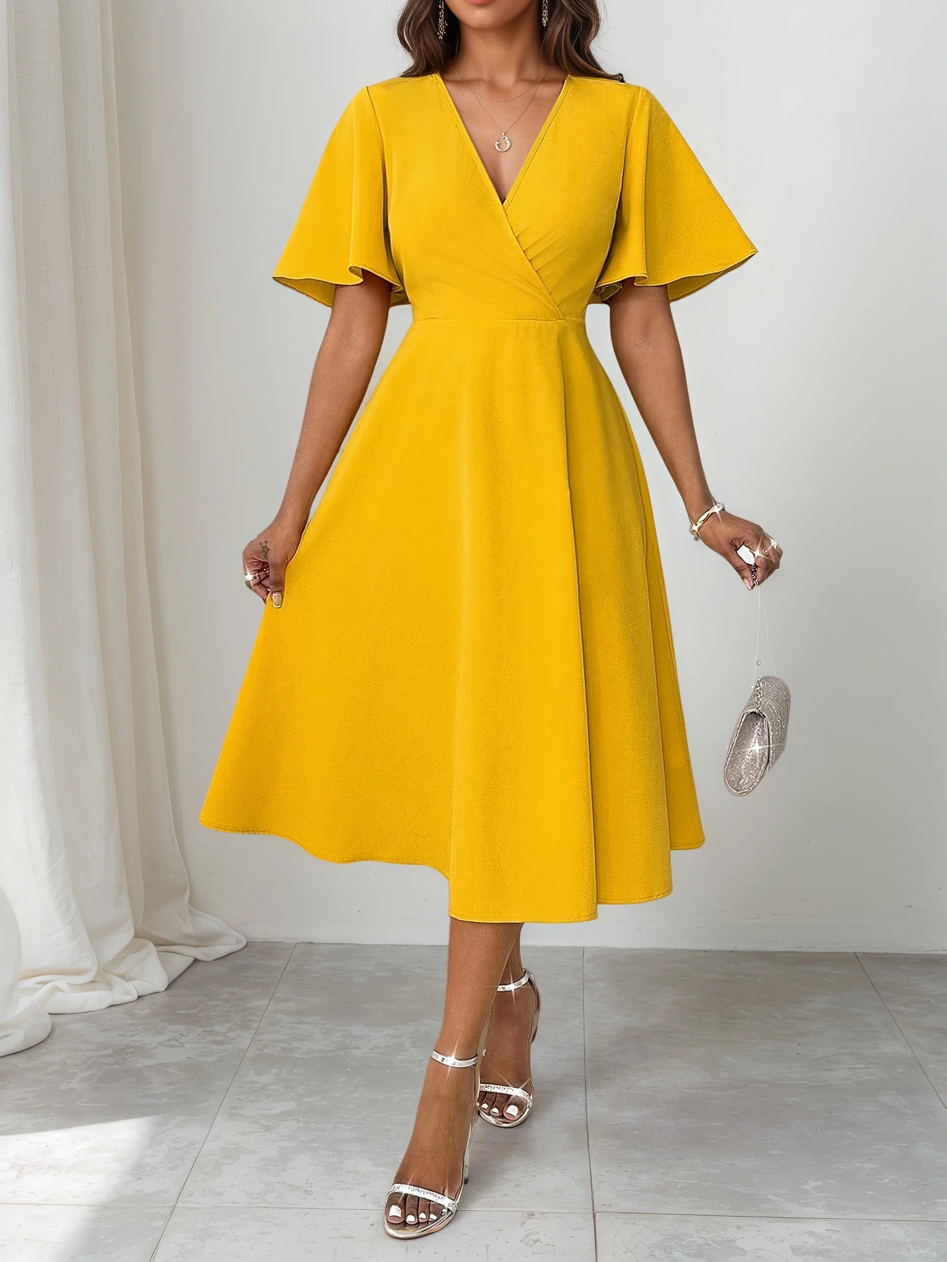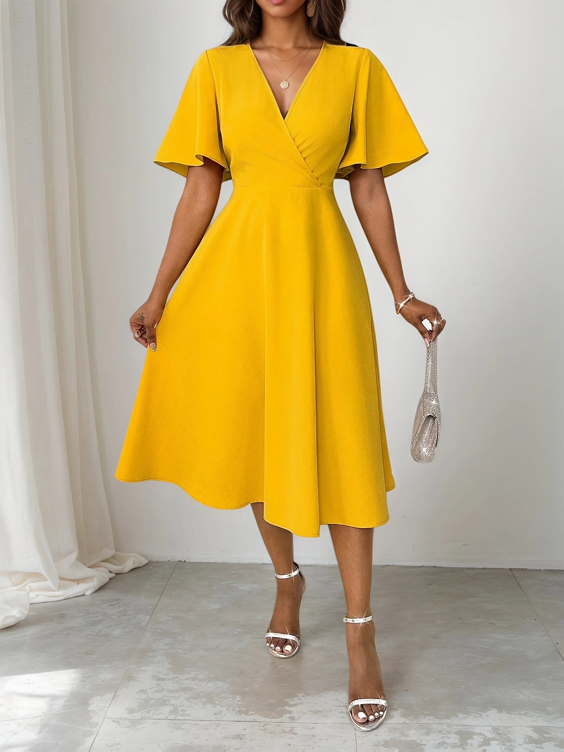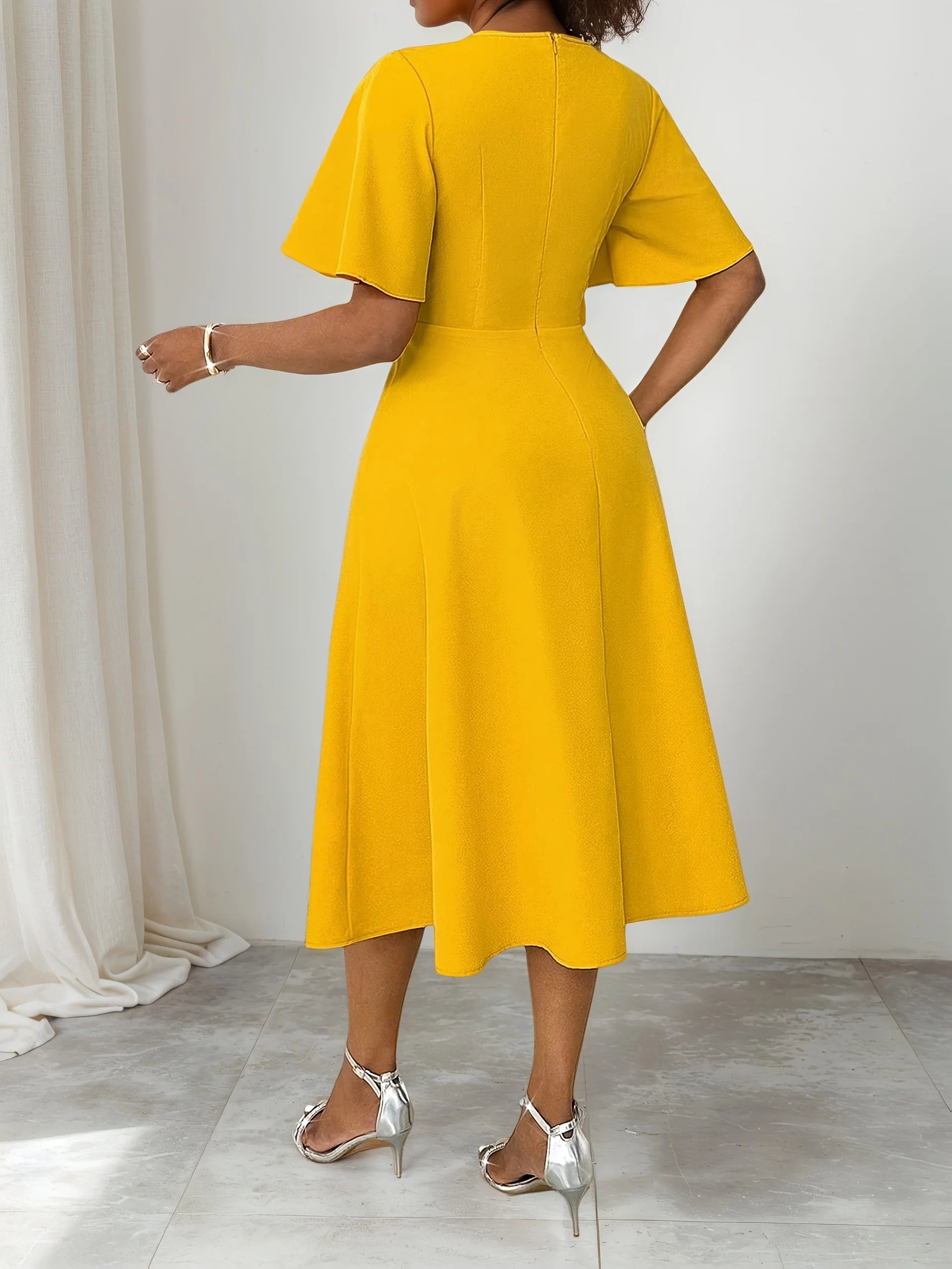 Vintage V Neck Tie Over Knee Short Sleeve Elegant for plus-size ladies Elegant Cinched waist Slimming Knee-length Dress