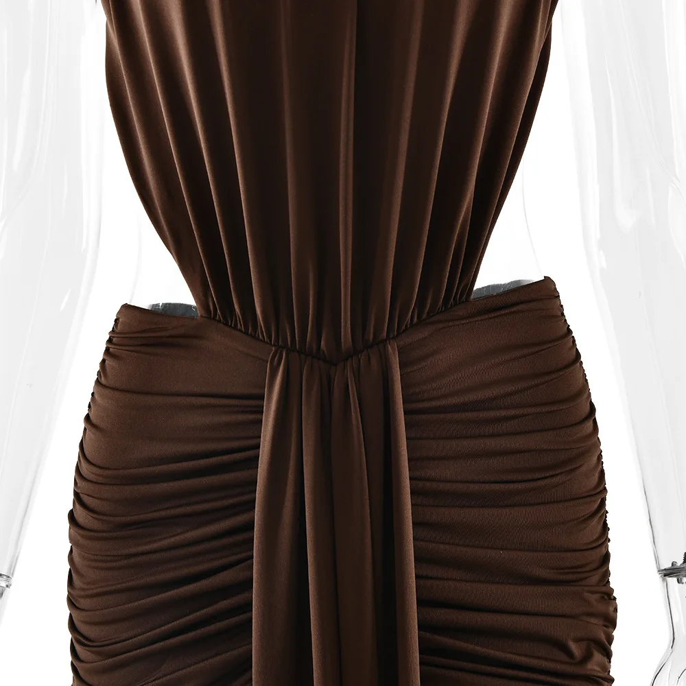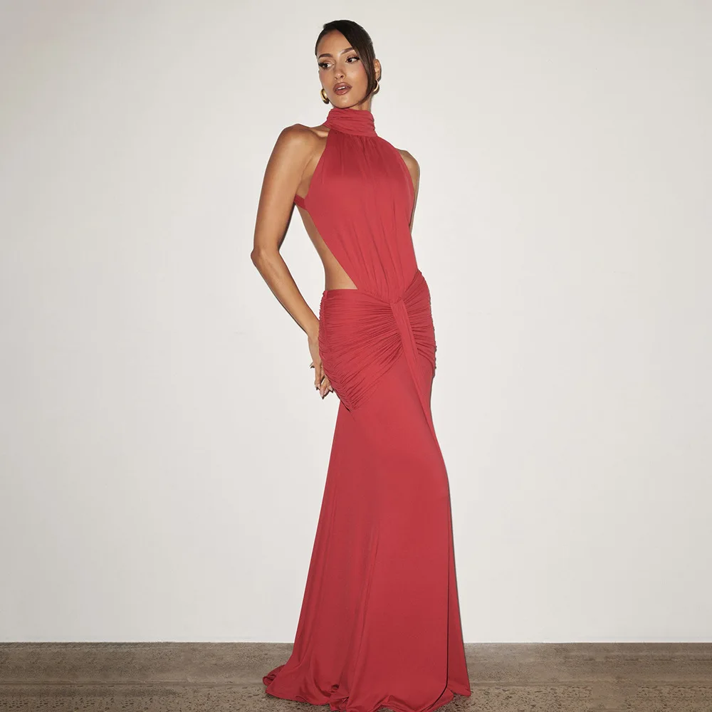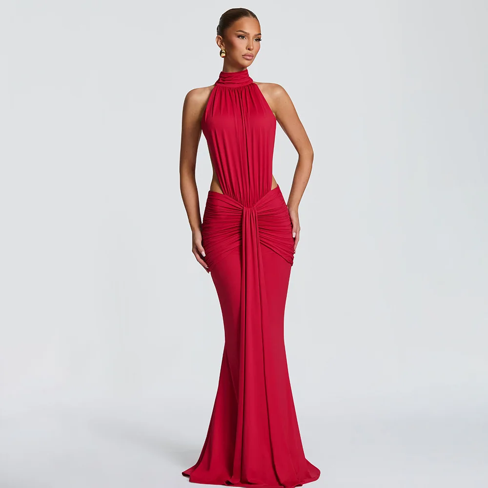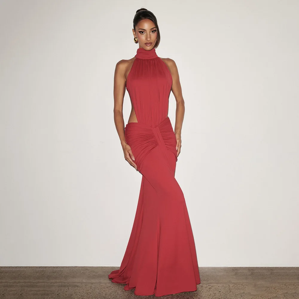 Turtleneck Backless Maxi Dress Women Gown Off-shoulder Sleeveless Ruched Bodycon Sexy Dress Female Pleated Club Party Long Dress
